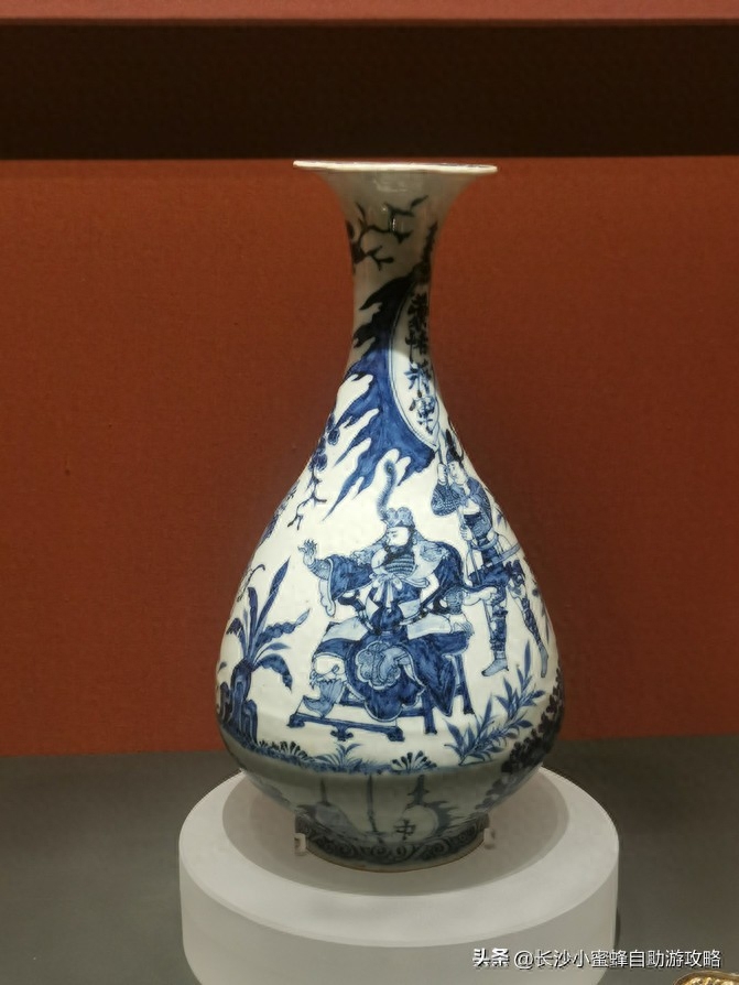 6、元青花玉壶春瓶:酒具,常与匝、托盏配套使用。瓶腹部中间头戴凤尾高冠、身着甲袍的武将是蒙恬,后立武士双手握书有"蒙恬将军"的大旗。一武士抓一跪着俘虏,另一武士似作汇报,人物间点缀以怪石、篱笆、花草等。此类元青花人物纹多取材于元杂剧,呈现一种新的艺术境界。整件瓷器质地细腻,釉色匀称,着色纯正,画艺高超,为元代青花瓷中之精品。