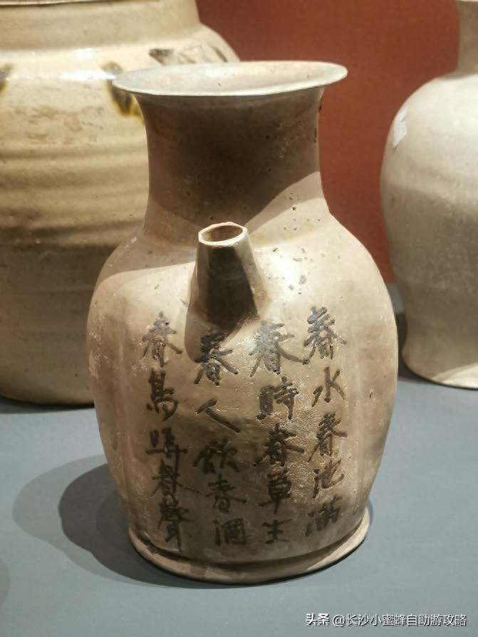 5、长沙窑青釉褐彩诗文执壶:长沙窑是中晚唐时期的民窑产品,主要烧造的是民用瓷,多为罐、碗、盘、盒、执壶等民用器. 突破了瓷器单一釉色的限制,开创了釉下彩装饰、文字装饰的先河。这件长沙窑诗文褐彩执壶,它通高19厘米,壶口外翻,粗颈短流,背部装有一执手,瓜棱形腹,平底,腹部有褐彩题写诗文一首: 春水春池满,春时春草生,春人饮春酒,春鸟哢春声。