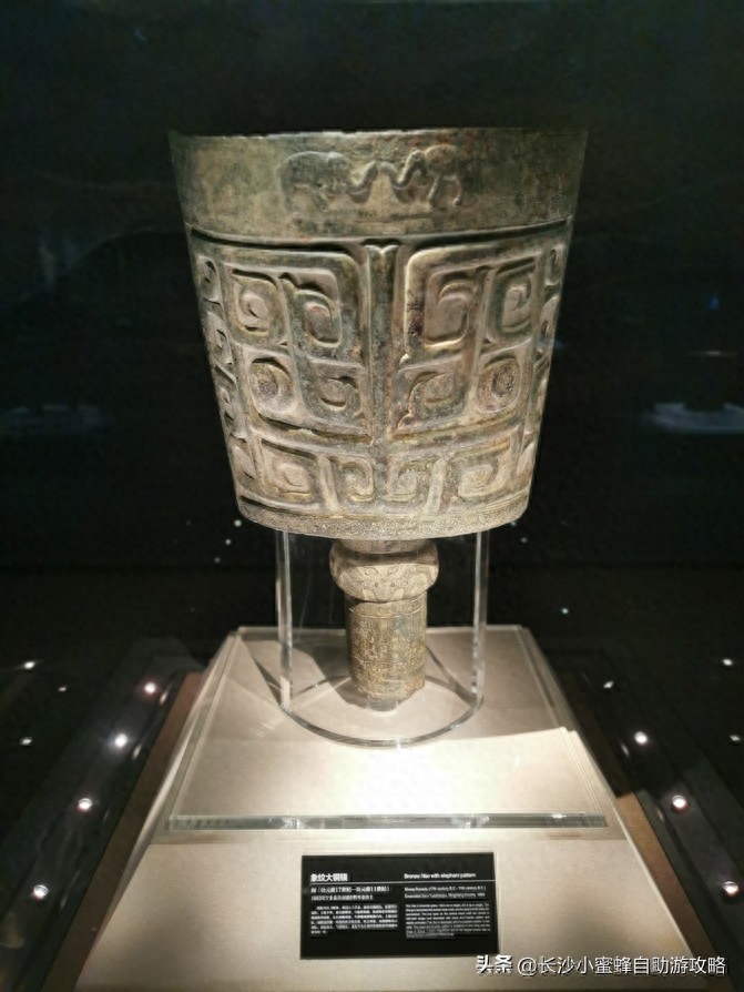 2、象纹大铜铙:商代文物,高103厘米,重221.5公斤,铙呈褐绿色,甬呈圆管状,钲部作合瓦形,主纹为粗线条组成的兽面纹,两眼为半浮雕的粗勾纹,鼓部饰一组相向站立、鼻子相连的象纹。