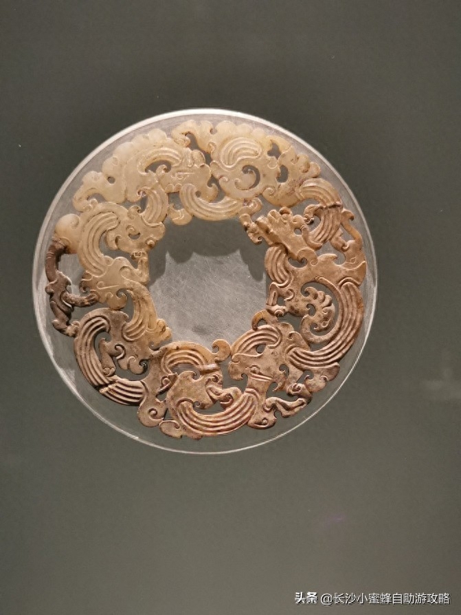 3、双面透雕龙纹青玉佩:战国时期文物,用青玉琢成。佩的边沿为弧形龙身,中心有一小圆孔,用以系绳佩带,是楚国玉器中的精品。