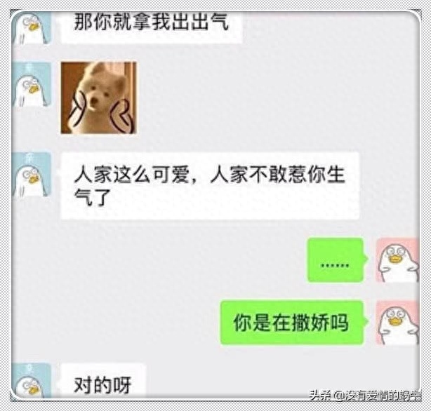女生应该是因为什么事情不高兴,男生就说让女生拿他出气,还说自己很可爱,不敢惹女友生气,还发了一个小表情。对于这样的男生,女生怎么会反感呢?女生问男生是在撒娇吗?男生很直白的说对的呀,这样的男友请给我来一打!