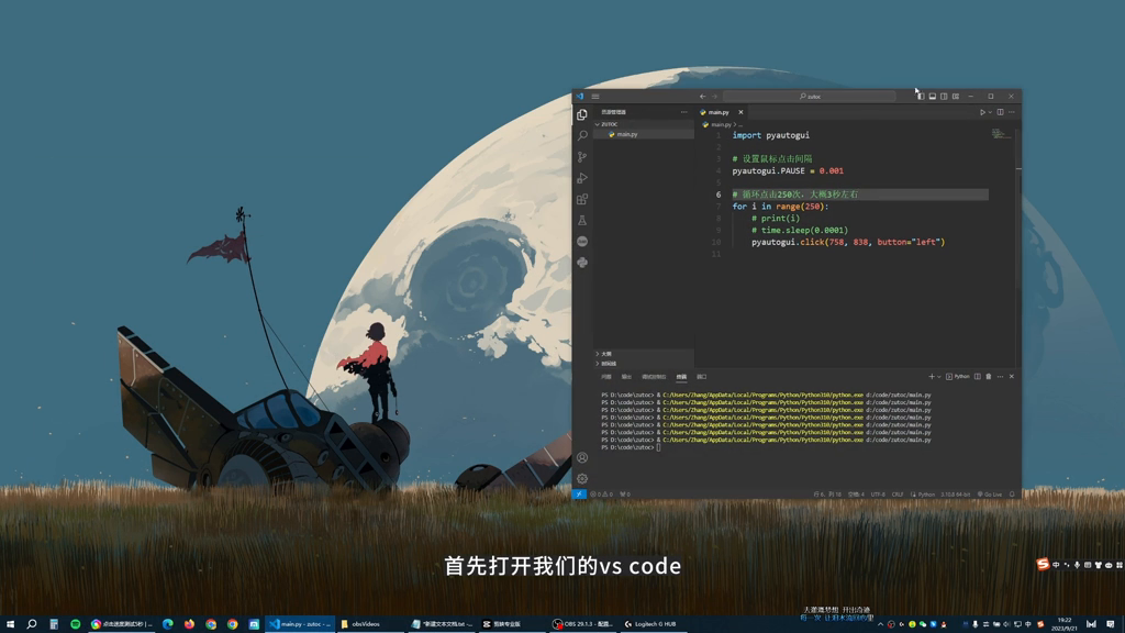 接下来,我们将介绍如何通过编程实现鼠标连点。打开vscode,这是一个使用Python编写的小程序,使用了Pyautogui库。