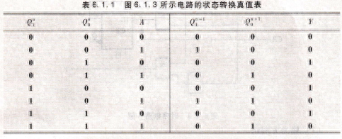 真值表,如表6.1.1所示。其中,输入变量为OI、0:和A,输出变量为Ol+1、0n+1和y。由于该表反映了触发器从现态到次态的转换,故称为状态转换真值表。