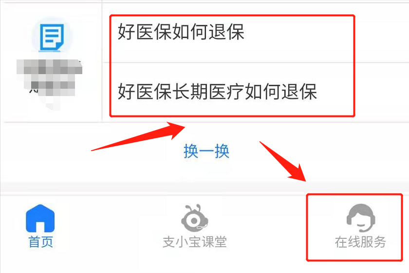 然后我们点击“我的客服”,会看到相应的提示,如果看到了关于好医保的提示,可以直接点击,如果看不到的话,可以直接点击在线服务,然后输入“好医保如何退保”,就会得到退保的入口。如下图: