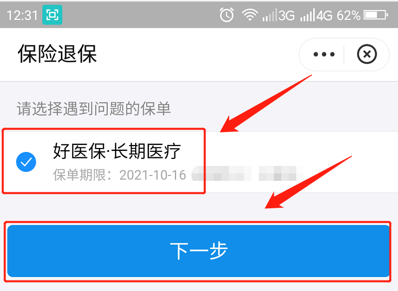 点击去退保以后,我们就可以看到自己的保单,然后勾选需要退掉的保险单子,然后点击下一步。如下图: