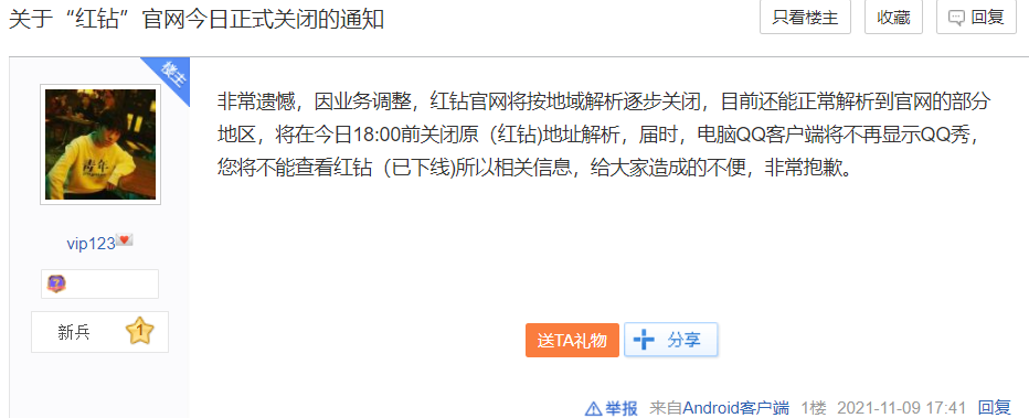 昨日,在红钻的百度贴吧里,有工作人员发布关于红钻官网正式关闭通知,能正常解析到官网的部分地区,也已经在昨日18点前关闭。电脑QQ客户端不再显示QQ秀,用户也不能查看红钻所有相关信息。