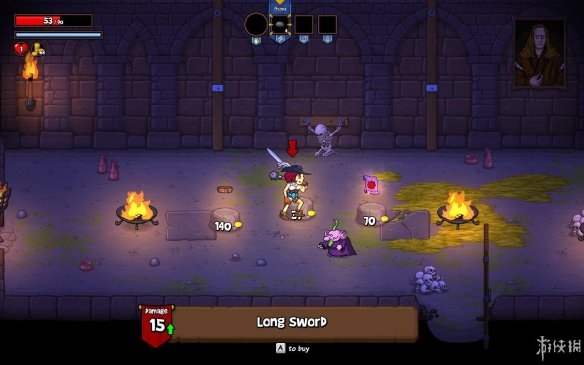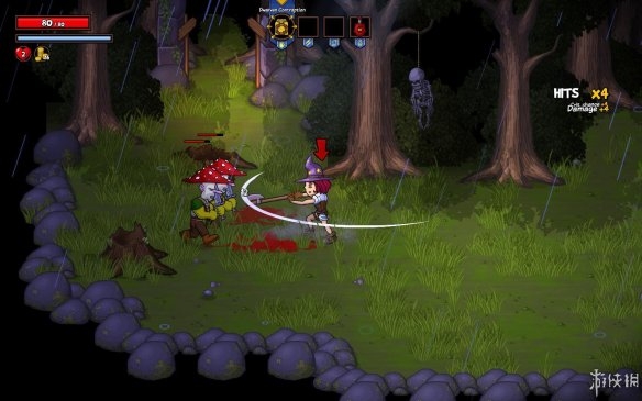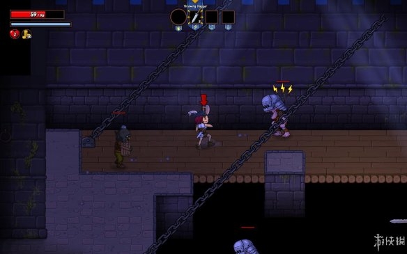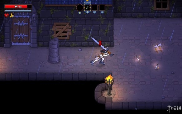 人物的攻击方式不是单纯的挥砍,配合着上下方向键能够使用出不用的攻击。而除了使用武器攻击之外,当角色得到某种魔法道具之后就可以使用魔法攻击了。魔法道具的种类很多,玩家可以在关卡之中不断的选择最厉害或者最适合自己的一种。人物的血量下方有能量条,使用魔法将消耗能量,停止使用后能量条开始恢复。魔法道具的攻击效果都比较炫酷,玩家在游戏中除了想得到一把好武器之外,一个厉害的魔法道具也是必不可少的。
