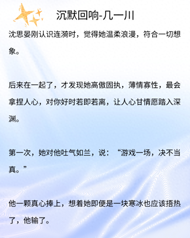 两人重逢后也因为酒后意外走到一起,沈思晏希望成为她的男友,但连漪心底并不相信感情,表面上对沈思晏也不是很在意,且无法给他回应。