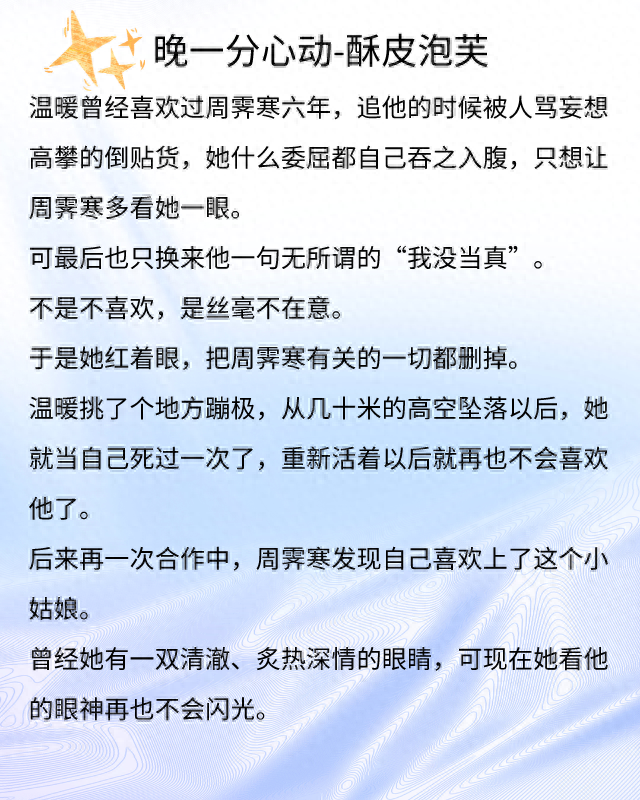 《晚一分心动》讲述的是有点自卑偏执坚强女主温暖和迟钝直男高冷男主周霁寒的爱情故事。