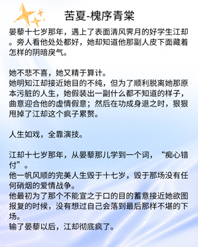 《苦夏》讲述的是江却和晏藜的故事,属于有目的接近,最终被发现,自己落得狼狈下场的追妻火葬场的故事。