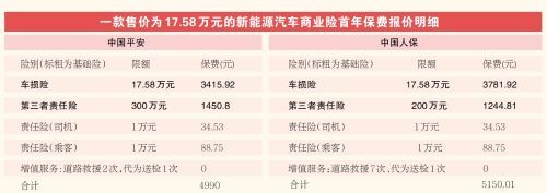 不同门店在新能源车险报价和服务上差别如何?近日,记者以购车者身份走访了多家新能源汽车体验店。以一款售价为17.58万元的混合动力新能源汽车为例,销售人员给出了中国平安和中国人保两家险企的首年车险商业险报价,分别为4990元、5150元。