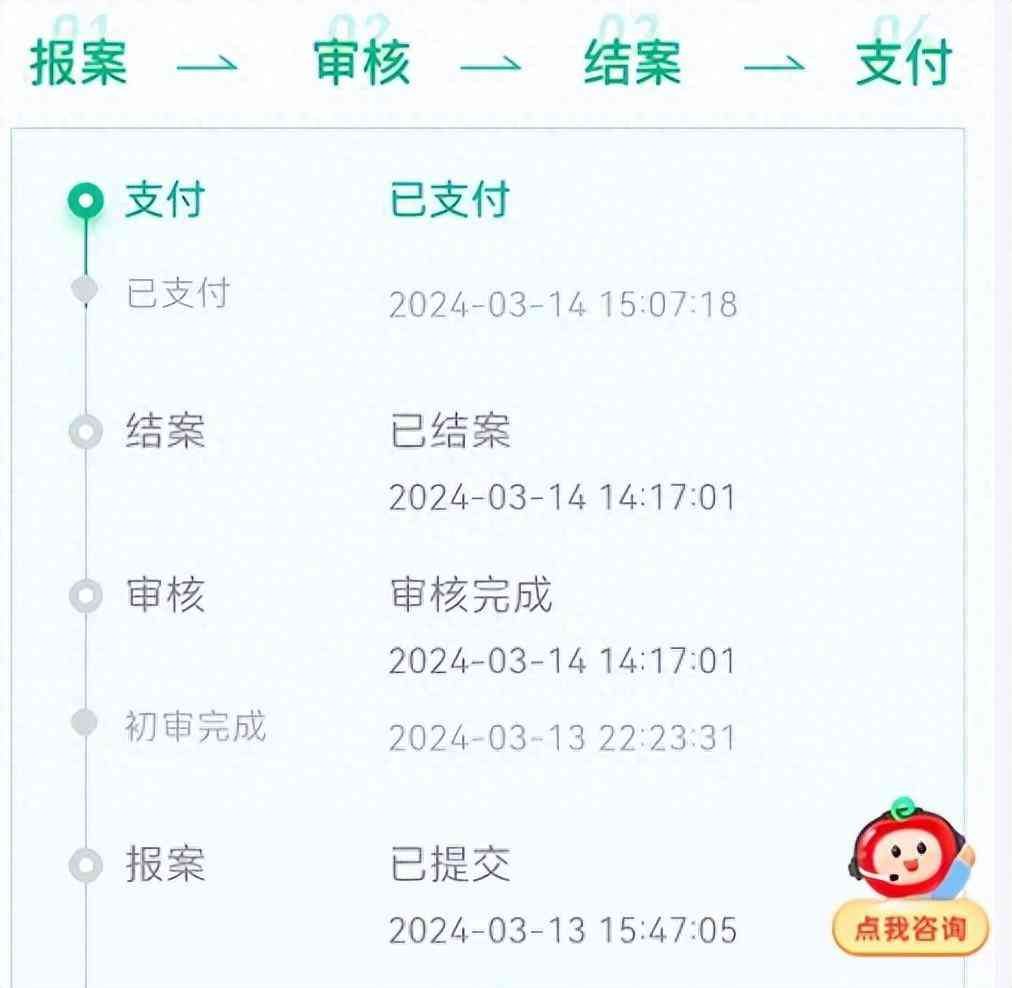 3月13日下午,客户在众安在线公众号提交了资料。3月14日下午,理赔款到账。