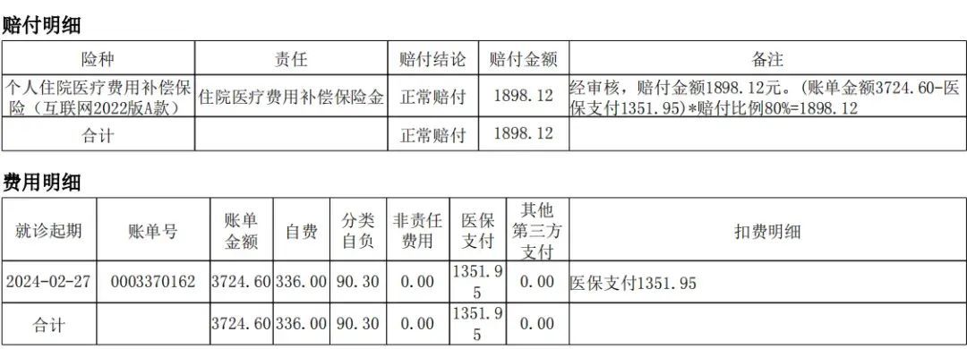 这款产品是住院0免赔,80%赔付,因此众安赔付1898.12元。