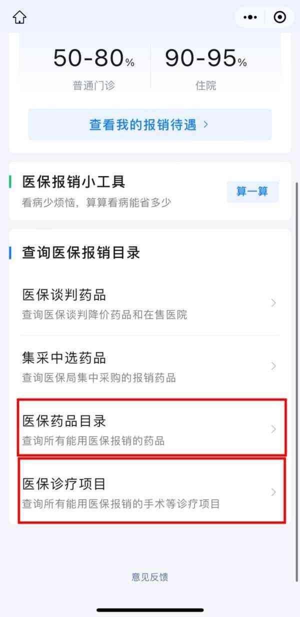 ● 点击“医保报销待遇”,还可查看到所在城市的医保报销目录,什么药能报,比例多少,一清二楚。