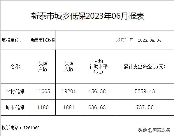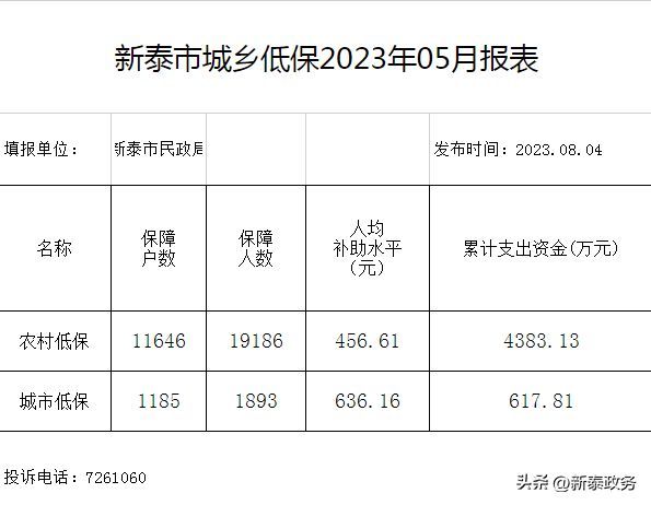 目前,新泰市城市低保标准为月人均收入915元,农村低保标准为月人均收入720元。截止2023年第2季度,全市共保障城乡低保对象12845户21082人,累计支出资金5996.99万元。