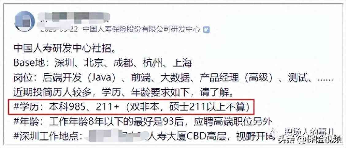 网友都觉得很惊讶了,不知道现在的人寿已经这么卷了,招人门槛这么高,起步都985了,未来可能还会收紧现在政策。
