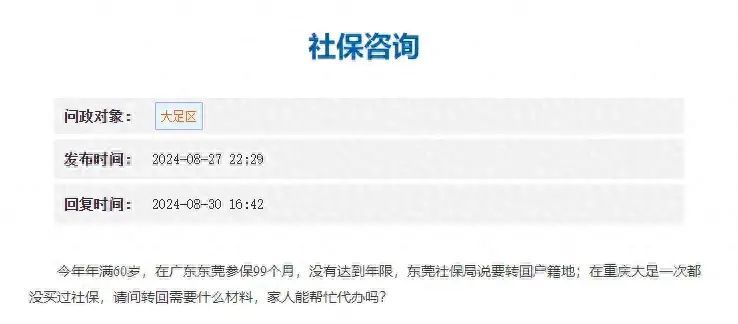8月27日,该网民向华龙网重庆网络问政平台反映,老家在重庆大足,工作地点在千里之外的广东东莞,今年满60岁,在东莞当地参保的养老保险关系累计时间达99个月,但还没有缴满年限,因工作关系要回到重庆大足区,养老保险关系也需要同步转回。
