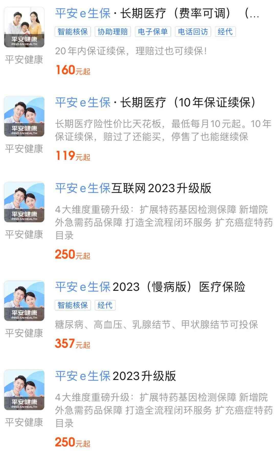 其次,保证续保20年的平安e生保有2款,一个是平安人寿的,但已经停售了,一个是平安健康的,目前还在卖。