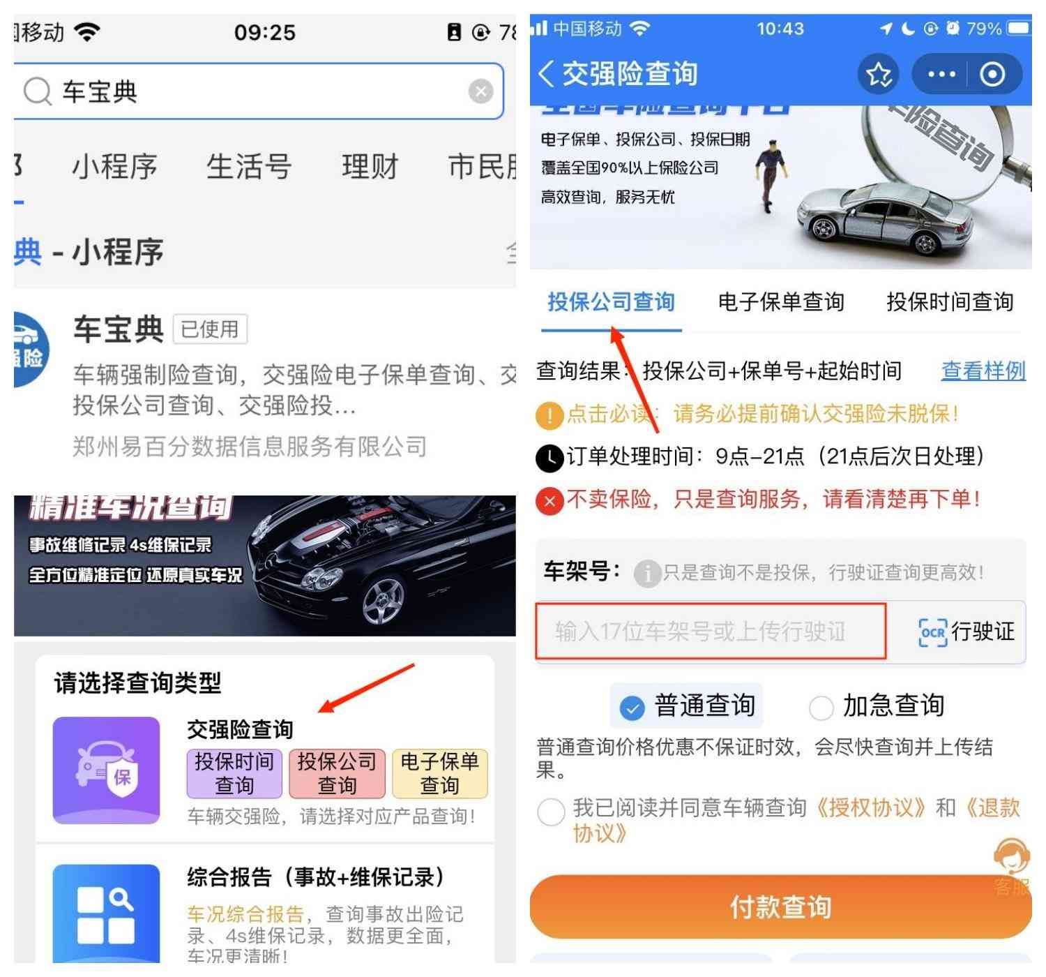 一、可以通过手机小程序查询。车主可以在手机支付宝上搜索“车宝典”,找到以后选择交强险查询,输入车辆的17位车架号或者行驶证,便能查到交强险的投保公司、投保时间、电子保单等信息,非常方便,节省时间精力。