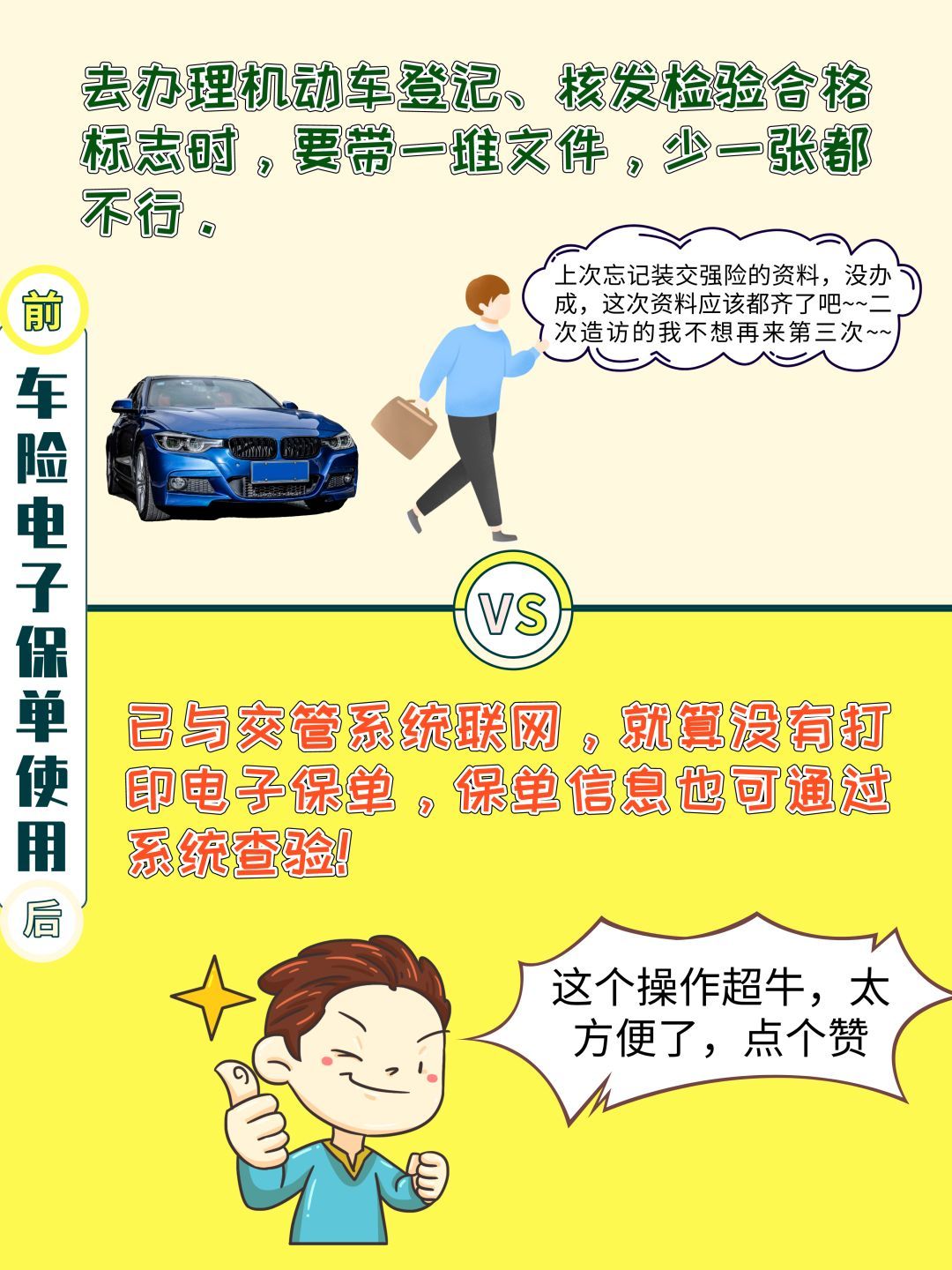 因为他车 险不是从我这里办理的,稍微费了些功夫才把电子保单发他。事后他跟我抱怨:“一年花几千块钱买的保险,连张纸都没有。” 相信不少车主朋友买完车险都会有这个感受。