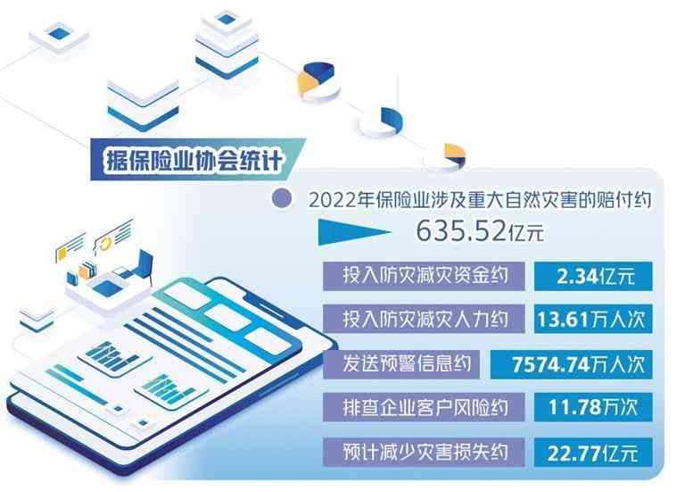 从保险业协会数据看,保险业在支持防灾减灾中发挥着日益重要的作用。2022年保险业涉及重大自然灾害的赔付约635.52亿元,投入防灾减灾资金约2.34亿元,投入防灾减灾人力约13.61万人次,发送预警信息约7574.74万人次,排查企业客户风险约11.78万次,预计减少灾害损失约22.77亿元。在灾害救援方面,协助救援受灾人员约14.49万人次,协助救援受灾机动车7.13万辆次,捐赠资金约705.43万元,捐赠物资折算金额约2186.83万元,捐赠保险的保额约4736.64亿元。