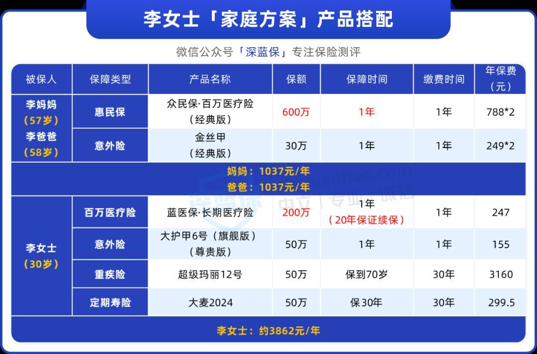 百万医疗险:蓝医保,每年最高有4万保额,不怕治不起病、吃不起药。意外险:大护甲6号(旗舰版),意外受伤的治疗费,符合条件5万以内花多少报多少。重疾险:超级玛丽12号,如果不幸确诊重疾,一次性赔50万,这笔钱怎么花都行。定期寿险:李女士是独生女,如果不幸离世,能给父母留下50万,保障他们的生活。配齐父母和自己的保险后,李女士安心了很多,价格也在预算范围内她十分满意。