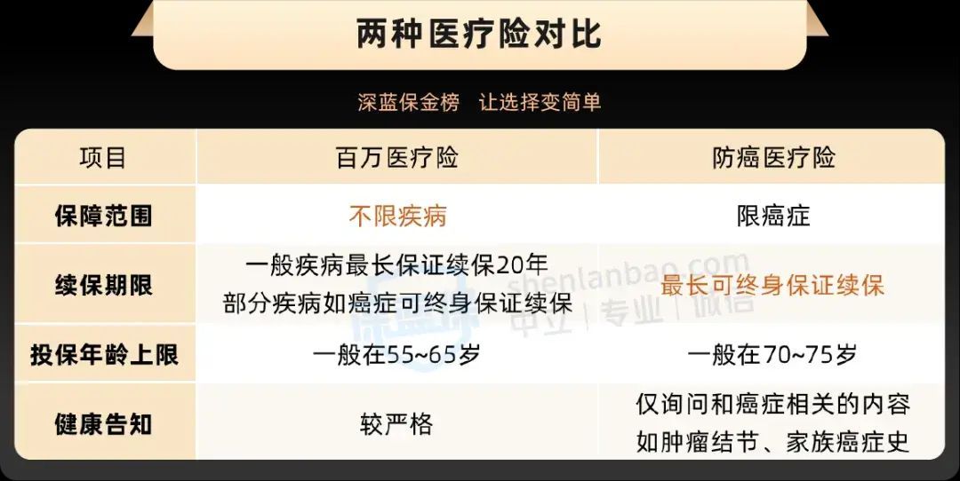 适合爸妈的医疗险,主要是百万医疗险和防癌医疗险两种,对比如下: