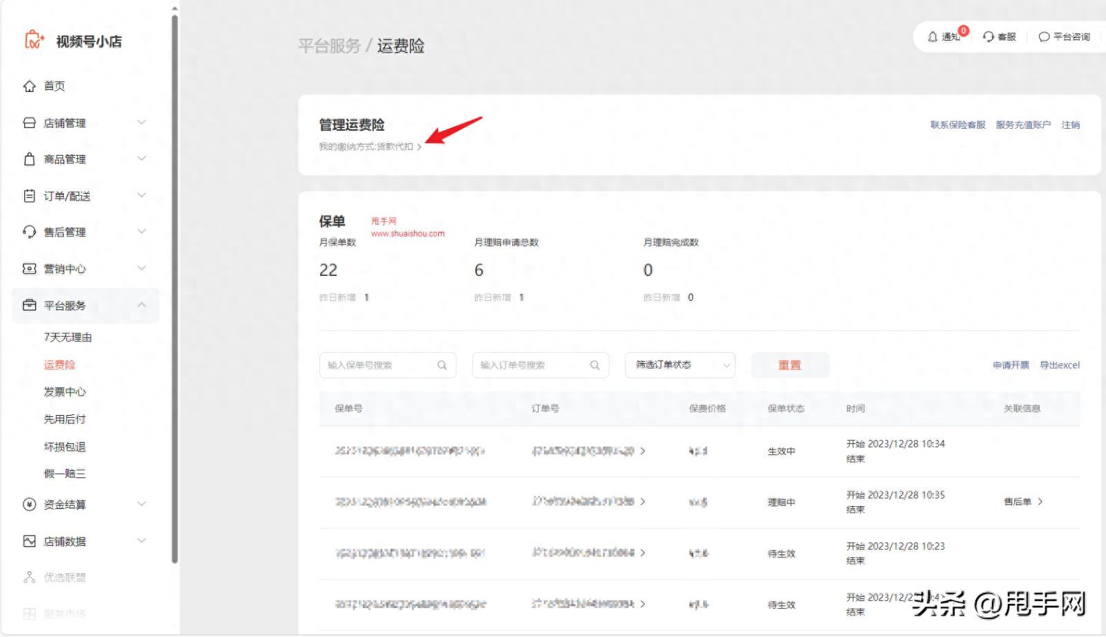切换路径:PC登录视频号小店-【平台服务】-【运费险】-【管理运费险】-【我的缴纳方式】