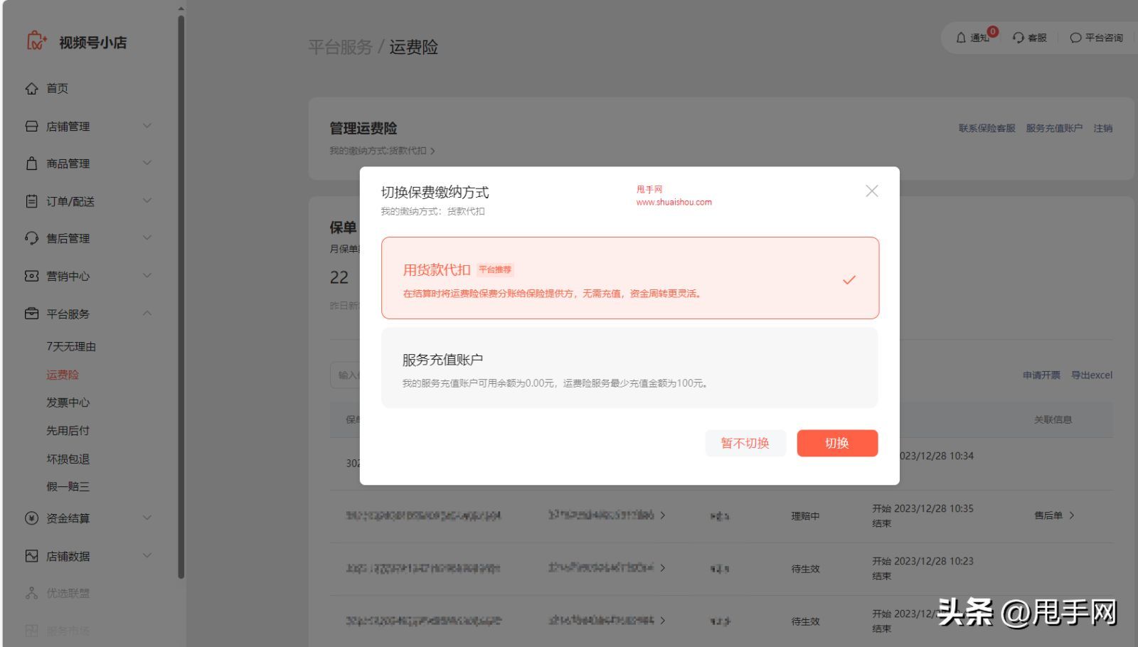 所有视频号小店商家在开通运费险时可根据页面指引选择优先使用的缴费方式,后续使用中,可由小店超级管理员操作切换保费缴纳方式。