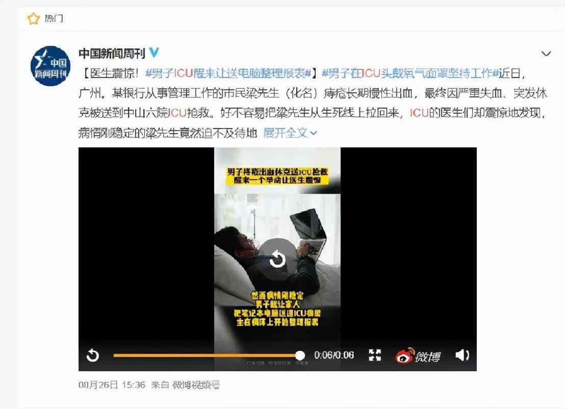 昨天,一则“男子ICU醒来让送电脑整理报表”的新闻登上热搜,某位银行从事管理工作的市民因突发休克被送到中山六院ICU抢救。好不容易从生死线上拉回来,ICU的医生们却震惊地发现,病情刚稳定的梁先生竟然迫不及待地请家人把笔记本电脑送进ICU病房,头戴氧气罩就开始坐在床上整理报表。热评第一的网友表示“不工作拿什么住ICU?“