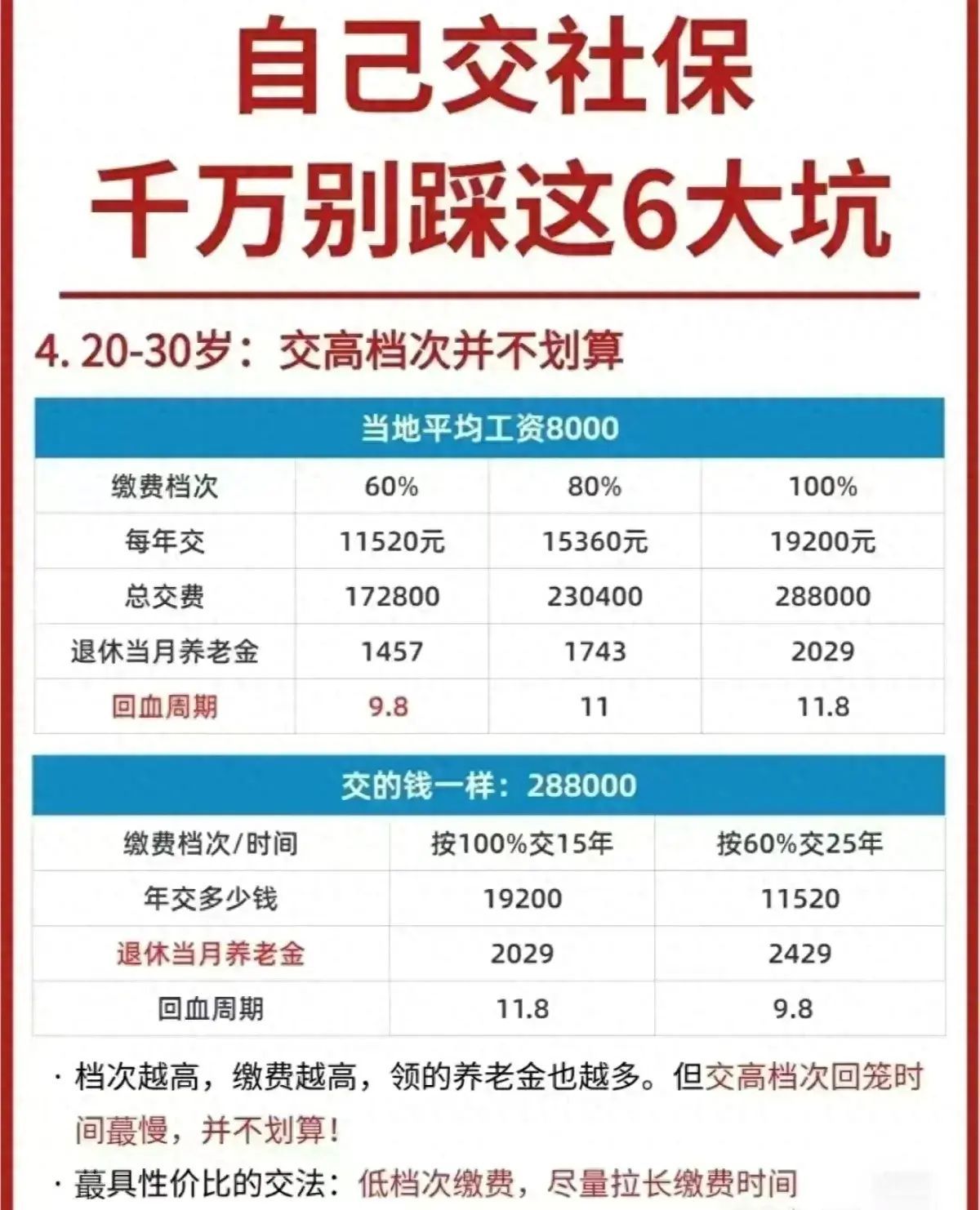 看到有人分享了这样几个知识,称自己交社保千万别踩的几个坑。但是说实话,从社保的专业角度来看,其实他所谓的这些“坑”结论并不准确。比如说下面这一个20岁到30岁,交高档次并不划算。
