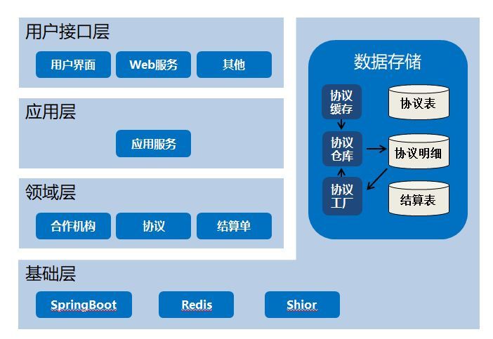 系统选用了领域驱动设计(DDD)的设计思路,这种设计思路的优点在于擅长处理高度复杂领域的难题,它通过围绕业务概念构建领域模型来控制业务的复杂性,以解决软件难以演进的问题,非常适合处理中介业务这类变化频次高、范围大的业务场景