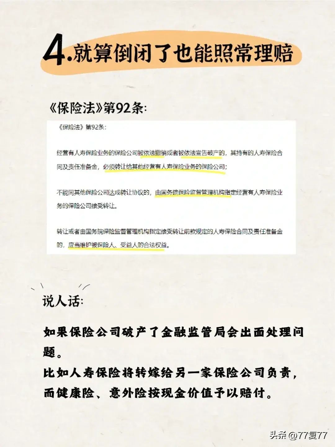 万一真的倒闭了也不用怕,《保险法》第92条规定,保险公司破产时,被保险人的合同会被转交给另一家正常运转的保险公司负责。这是国家来指定的,所以不用担心因为保险公司的问题,自己交的钱就白花了