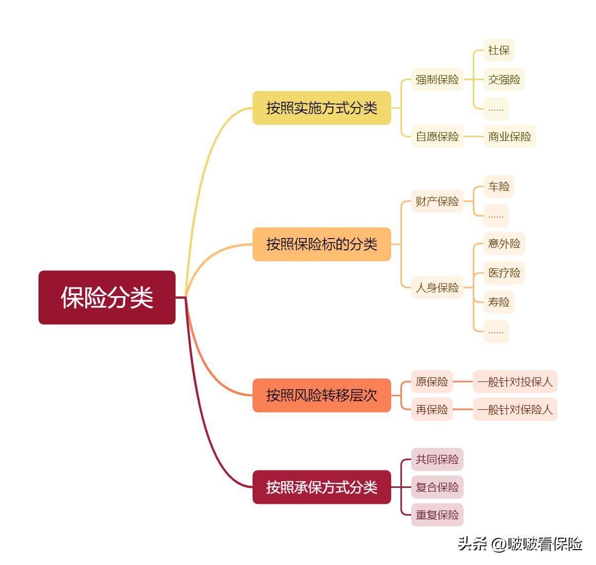 目前比较流行的保险分类方式一般有四种,先上思维导图: