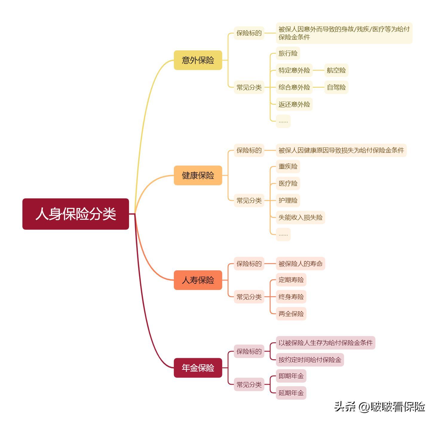 说完了保险大的分类,再来看看我们普通人涉及比较多的人身保险的分类。同样,先上导图: