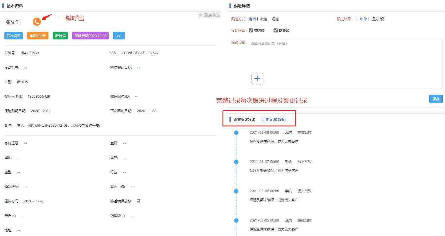 智能提醒即将到期客户,支持坐席一键呼出,录音自动上传,方便管理层检核。