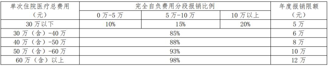 如东县基本医疗商业补充保险1.参保人因特殊病门诊、疾病住院及使用国家谈判“双通道”药品,在按规定享受基本医疗及自费补充保险待遇后年度完全自负的医疗费用,起付线以上的部分按以下分段及补偿比例报销。