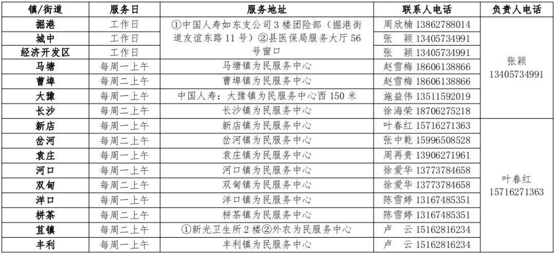 中国人寿定期在各镇定点场所驻点,及时为参保人提供相关理赔及咨询服务。业务及售后服务电话:84514931 84513610 95519;服务监督电话:84112730