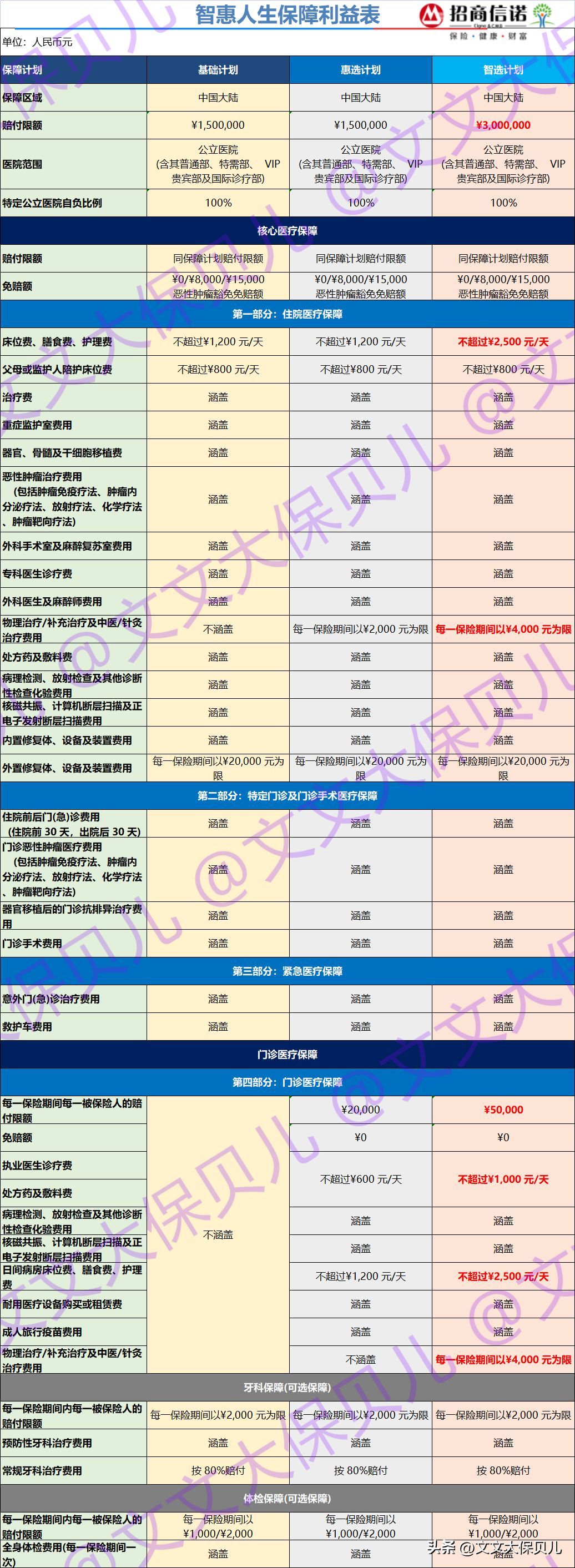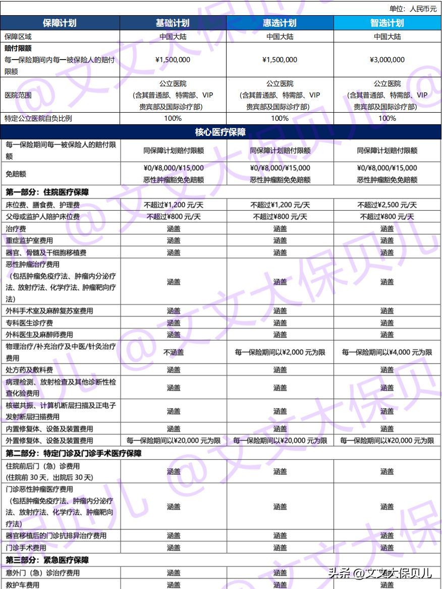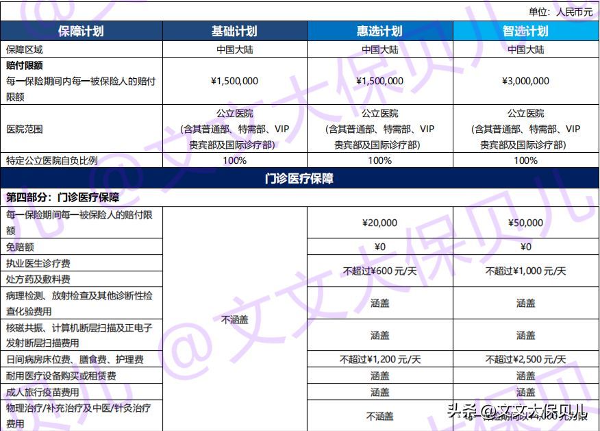 包含门诊保障的惠选计划和智选计划,基础的保障部分区别不大,主要区别在保额不同: