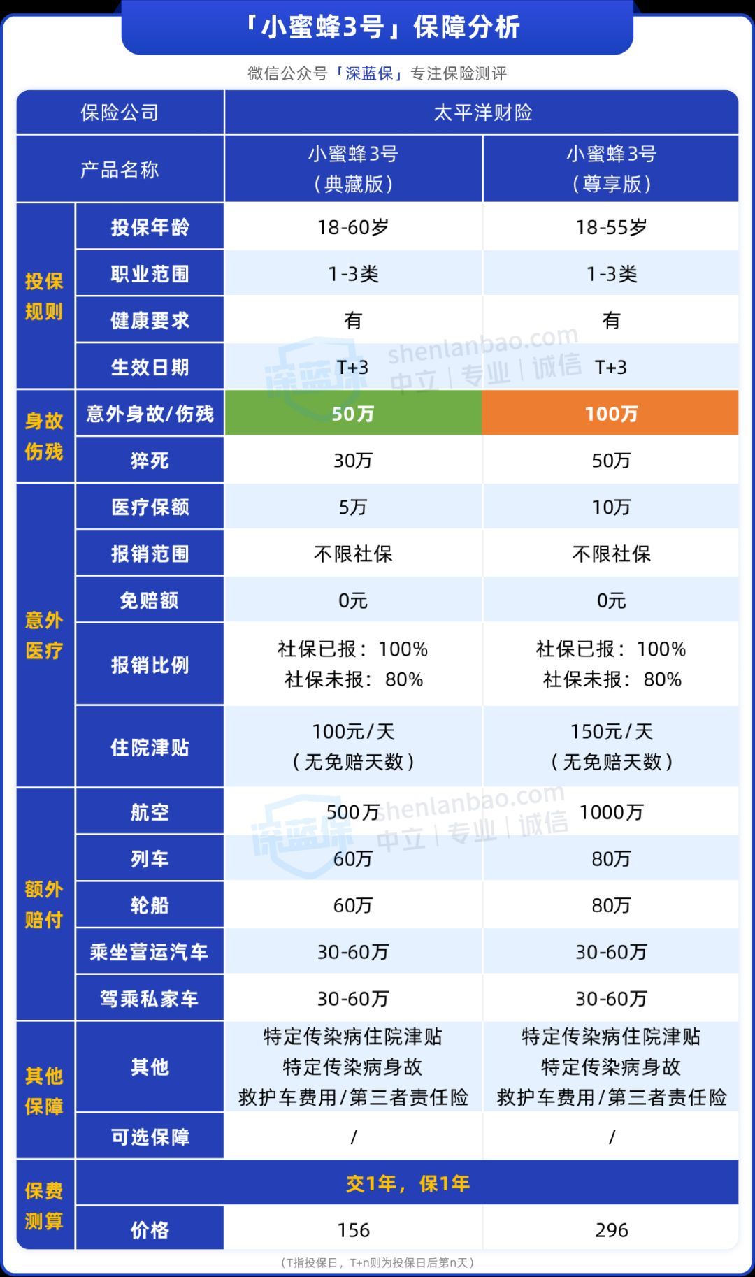 小蜜蜂3号由太平洋财险承保,最高投保年龄为60岁,先看产品表格: