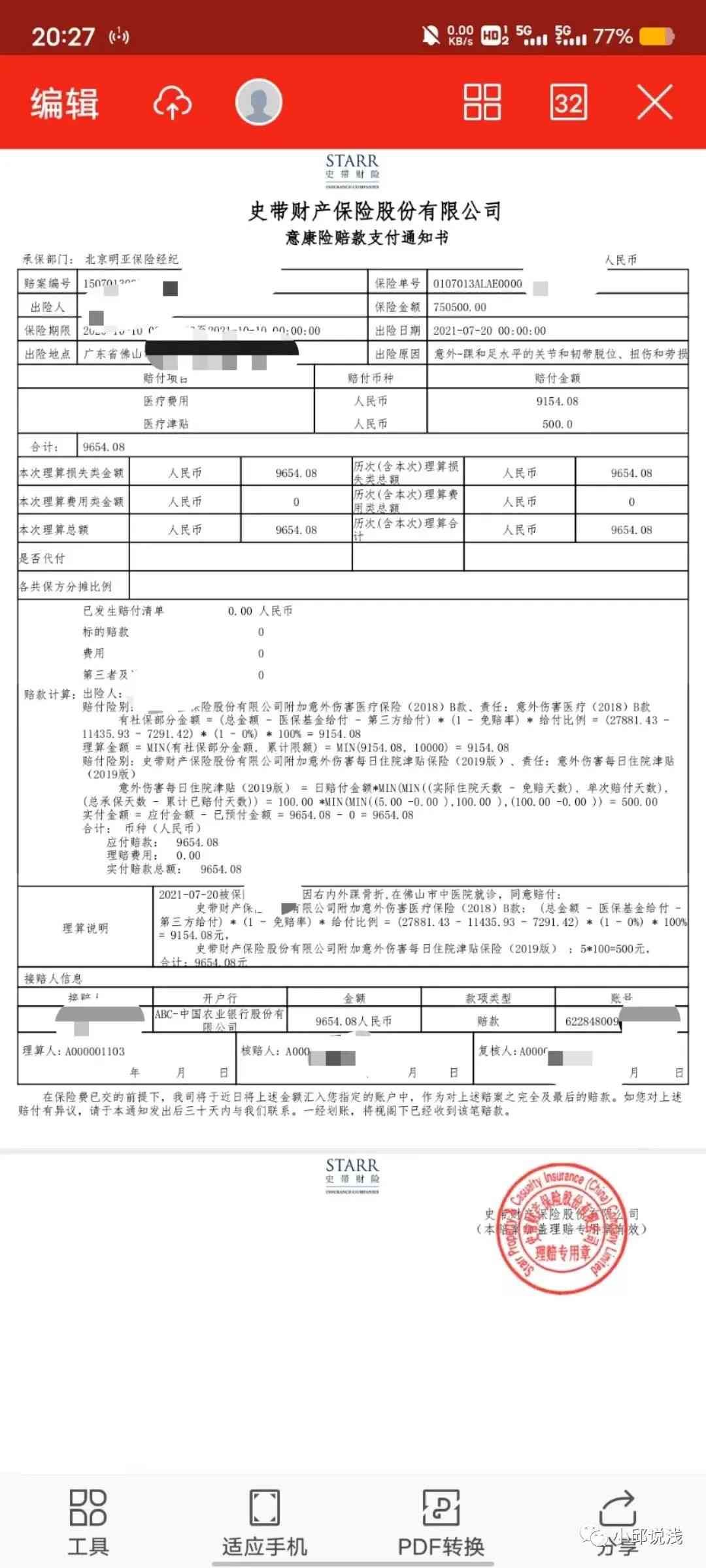 向史带财险申请理赔,剩余0.9万医疗费用获得全额报销,同时获得5元的住院补贴,共计赔付9654.08元。