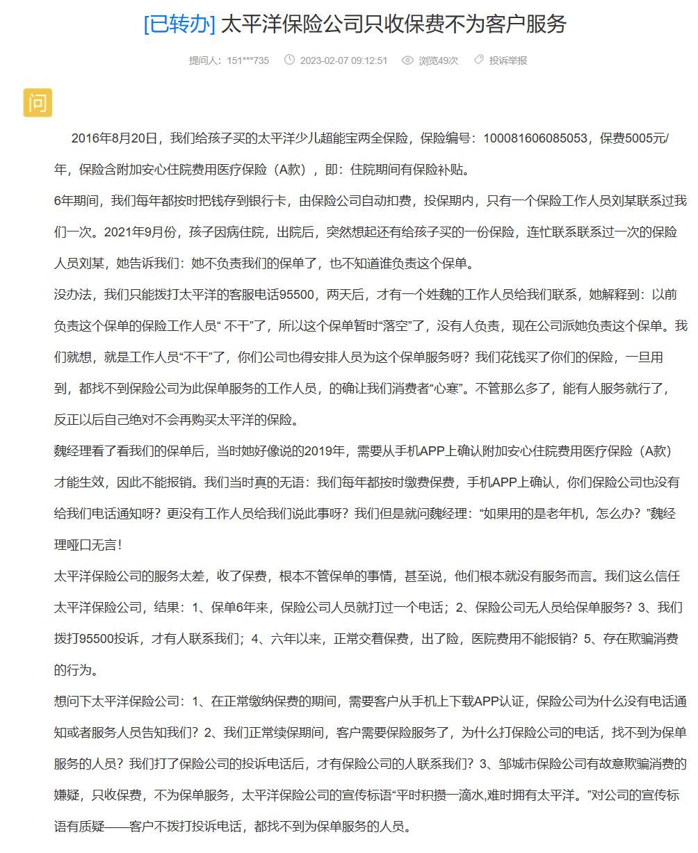想问下太平洋保险公司:1、在正常缴纳保费的期间,需要客户从手机上下载APP认证,保险公司为什么没有电话通知或者服务人员告知我们?2、我们正常续保期间,客户需要保险服务了,为什么打保险公司的电话,找不到为保单服务的人员?我们打了保险公司的投诉电话后,才有保险公司的人联系我们?3、邹城市保险公司有故意欺骗消费的嫌疑,只收保费,不为保单服务,太平洋保险公司的宣传标语“平时积攒一滴水,难时拥有太平洋。”对公司的宣传标语有质疑——客户不拨打投诉电话,都找不到为保单服务的人员。