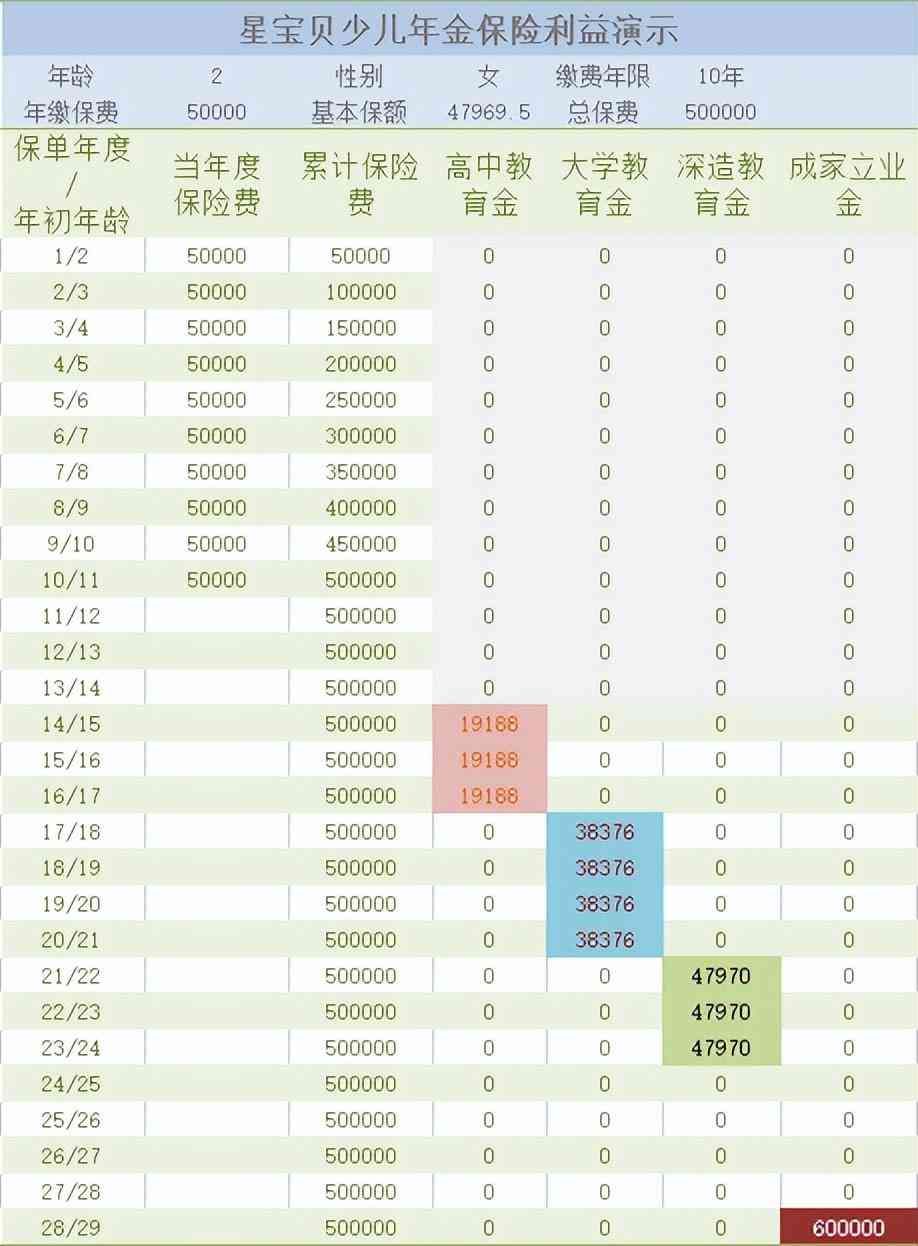 客户资料:2周岁,女孩,选择5万交10年,一共50万,专门用于孩子教育规划,量身定制,满足成长关键阶段费用需求。