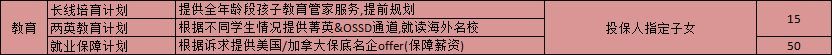 配置星宝贝教育金,投保人可以指定子女享受复星保德信提供的一些列增值服务,当保费达到一定规模时,可以让孩子享受到全年龄段孩子教育管家服务,提前规划或者提供海外菁英&OSSD直通车,一站式就读海外名校,甚至可以提供美国/加拿大保底名企offer(保障薪资)的名额,让孩子真正的应在起跑线上。