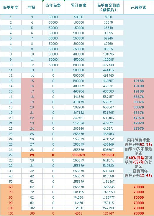 ③在孩子22-24周岁大学毕业孩子希望继续深造,可每年领取47970元作为零花钱,满足孩子读研期间的花销,得到最好的教育,3年一共领143908元;