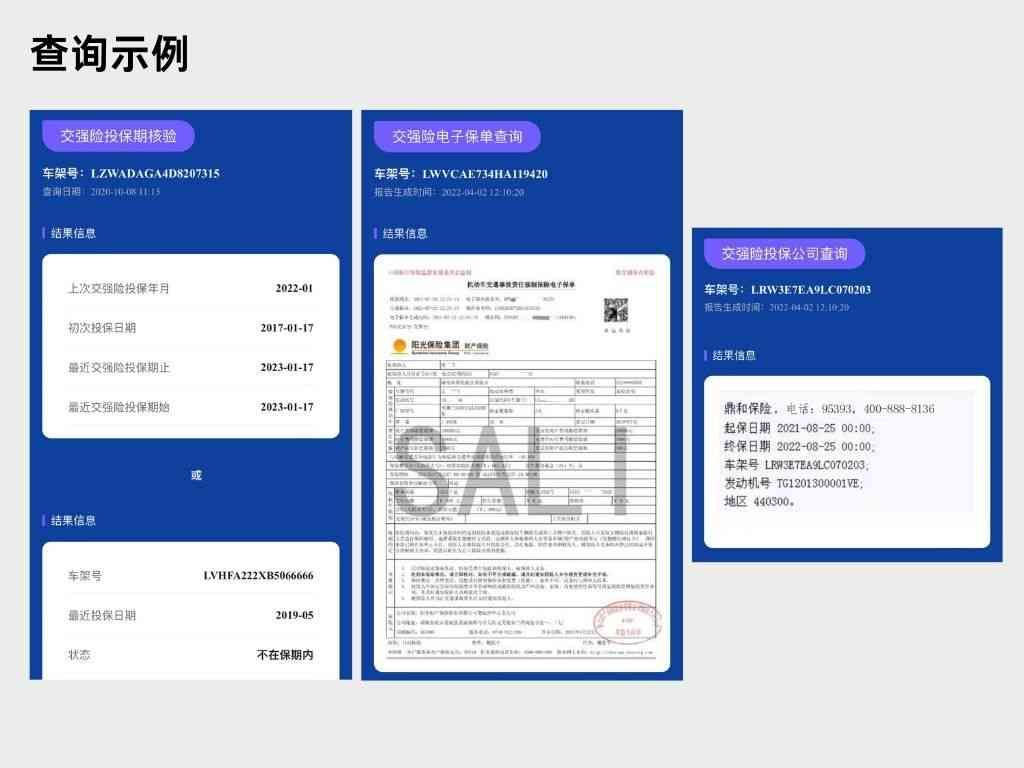 输入车架号或上传行驶证照片,即可查询车辆交强险的电子保单、投保时间、投保公司等详细信息。