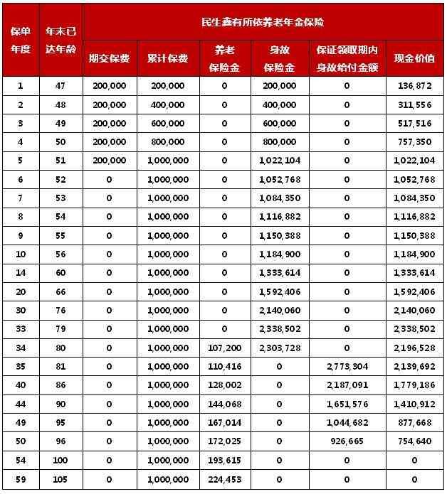 4、上表中的现金价值不包括保单年度末的养老保险金的保险和利益。当您解除合同时,本公司将退还上表中现金价值,在考虑所在保单年度末的养老保险金后根据精算原理计算的金额。您在犹豫期后解除合同会遭受一定的损失。