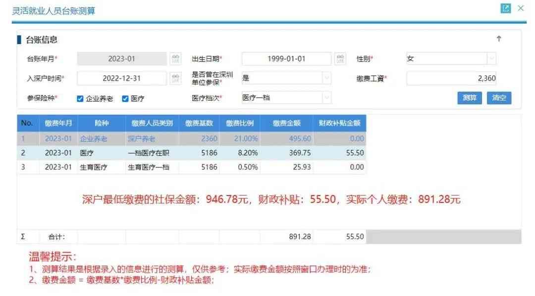 四、深户灵活就业人员社保缴费测算(每月补贴55.5元,补帖金额每年会有少量上涨):