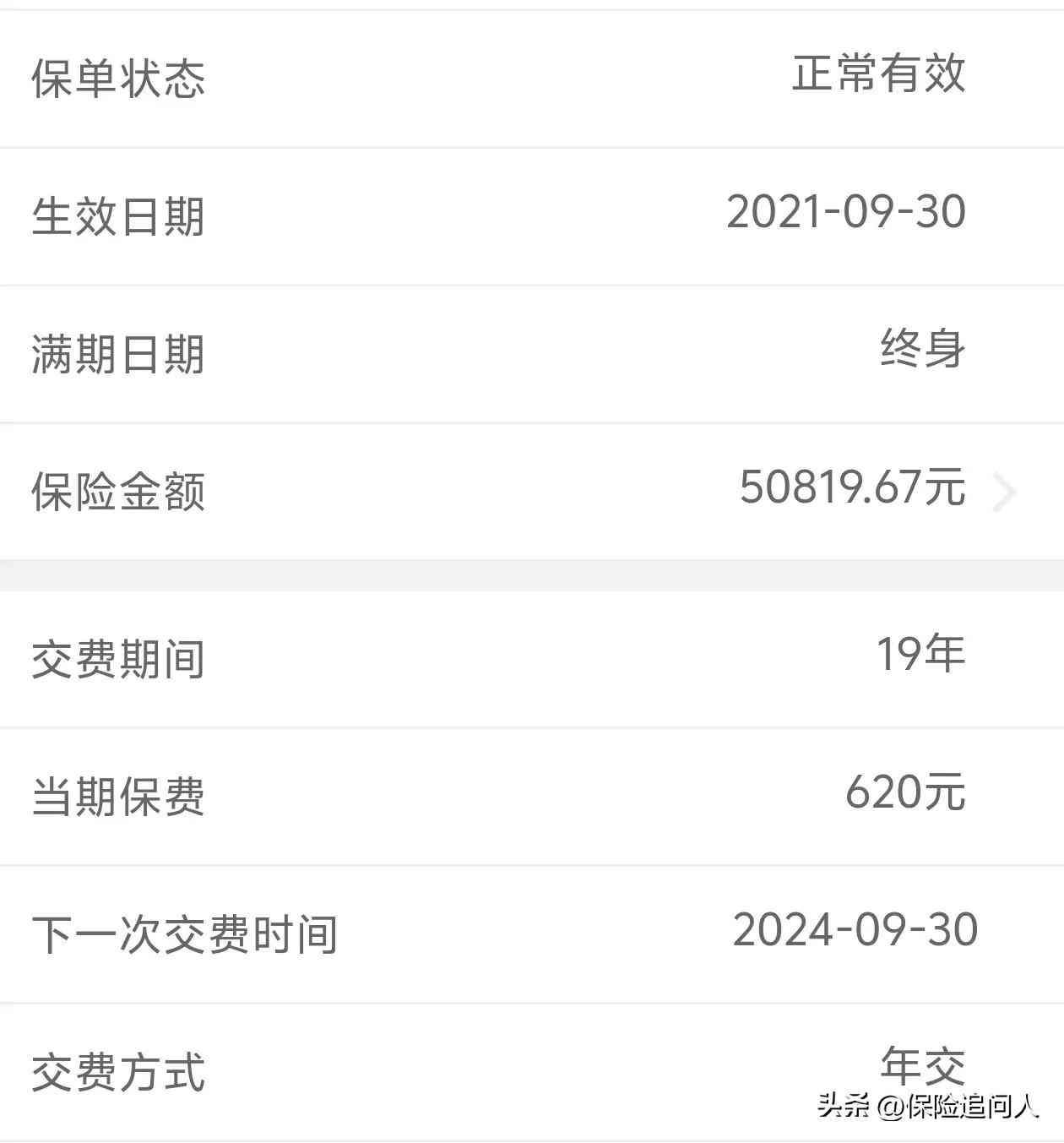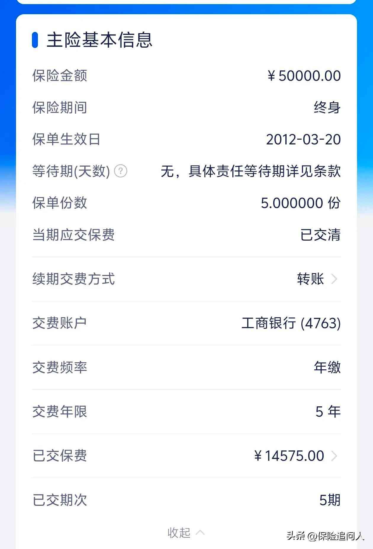 买完这么多年,从来没有仔细研究过,因为保费也不贵,每年35多元,只交五年,合计1万8千元,并且老早就交完了,后来也就没有琢磨。