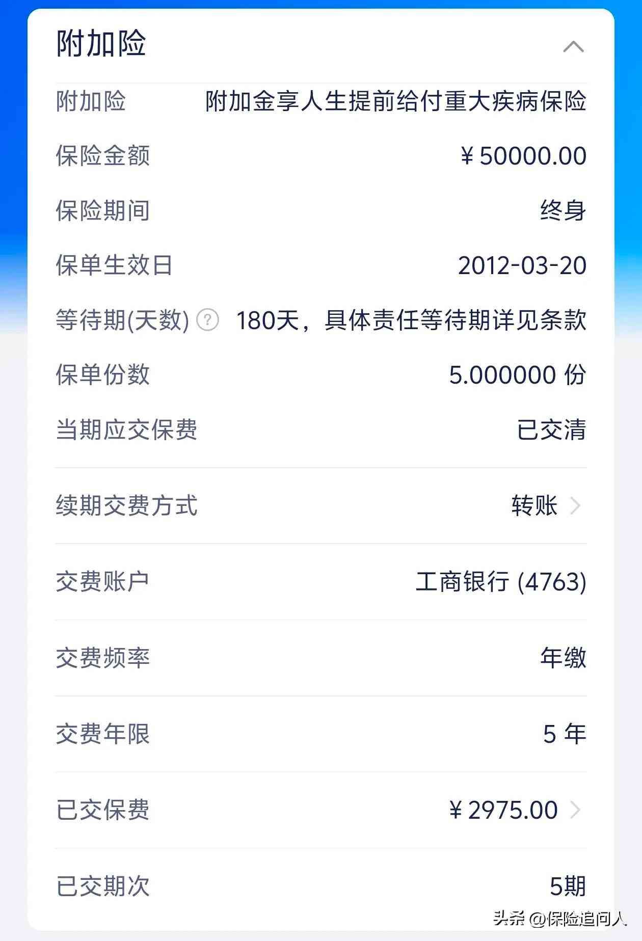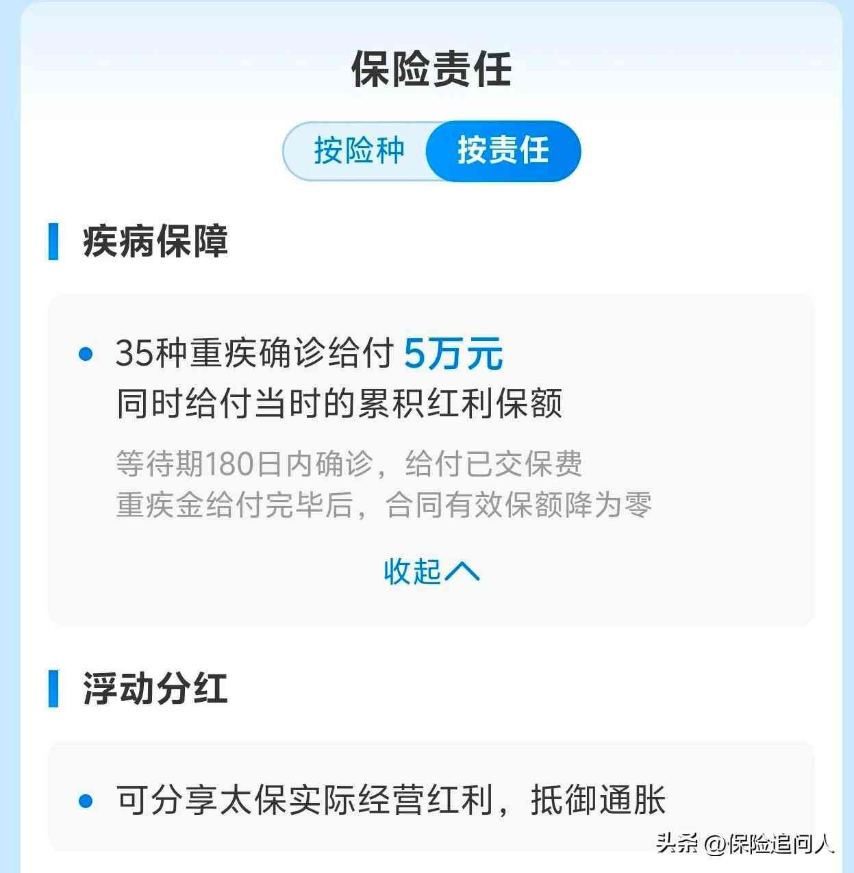 它属于终身寿险,然后附加了重疾险,终身可以保障35种重疾,能够赔付5万元。